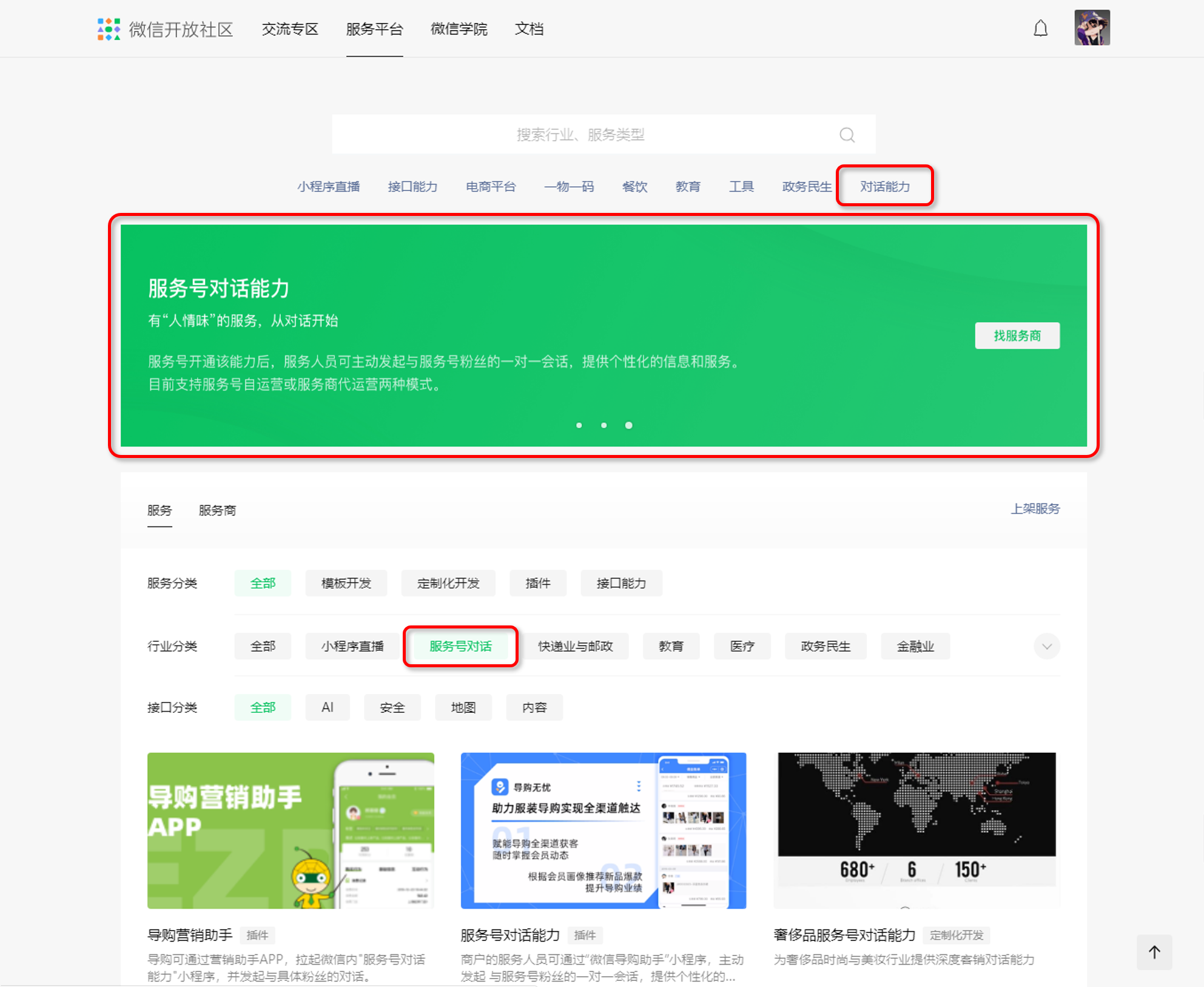 为了帮助服务商的服务被更多商户发现,微信服务平台新增“对话能力”专区、banner和行业分类标签,展示服务商提供的对话能力相关服务信息。详情请点击:微信服务平台-对话能力专区