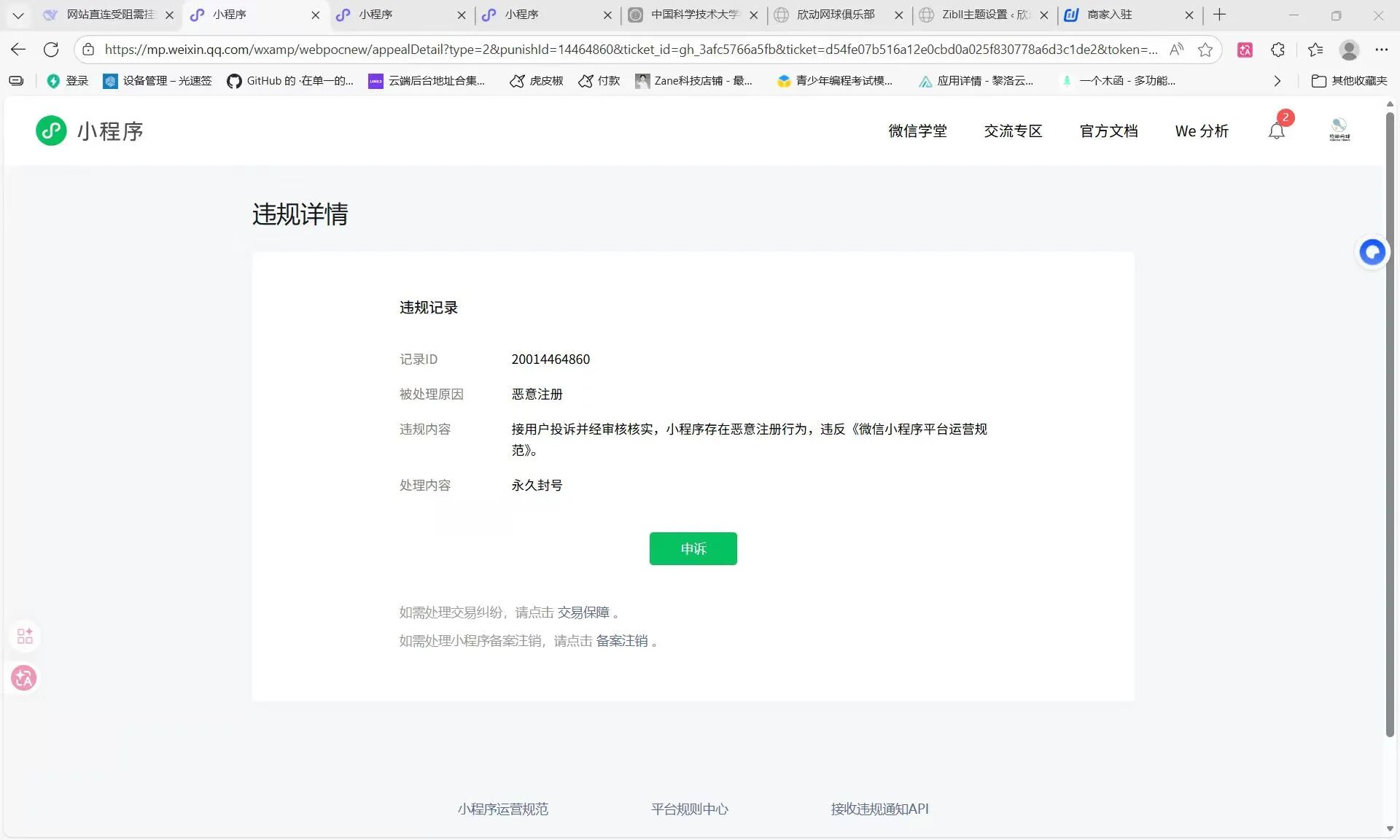 小程序封禁,原因是恶意注册,小程序代码刚上传审核好,不到两小时说封了,还是用户恶意举报,可是这个小程序今天第一次上线,且只有我们几个开发者使用过