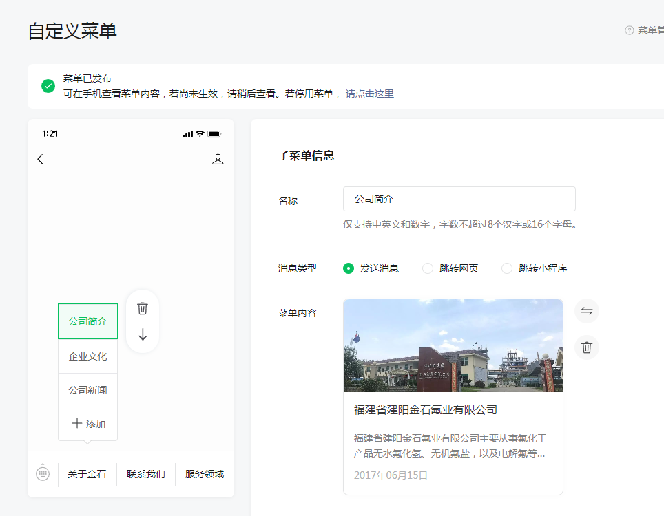 你好,我是一企业负责人,公司的公众号是我在管理,我想问下如何更新公众号里面的内容?比如:公司简介,产品图片,等等?