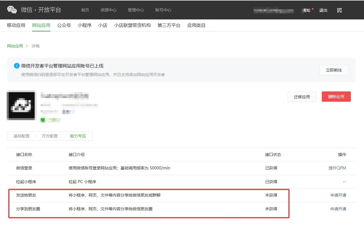 微信开发者平台发送给朋友、分享到朋友圈已获得,微信开放平台内部还是未获得?