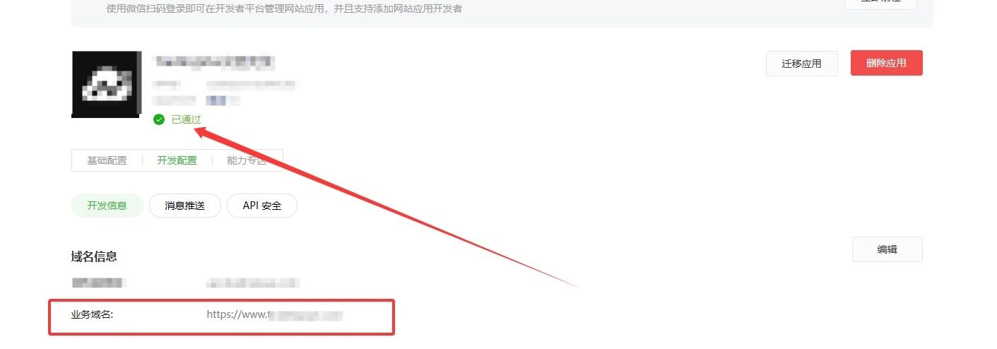 应用审核通过了,业务域名也配置了,如下图所示。