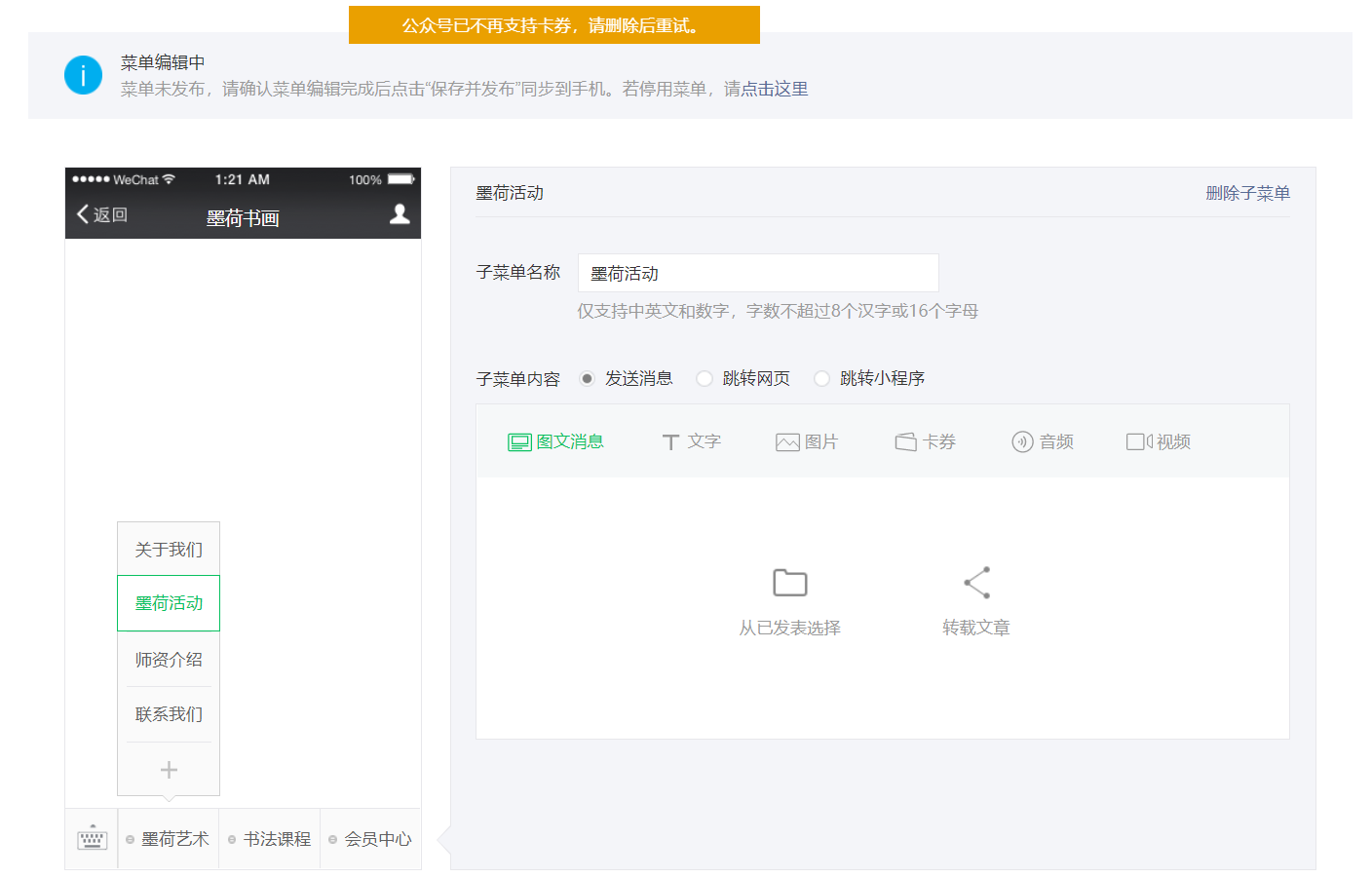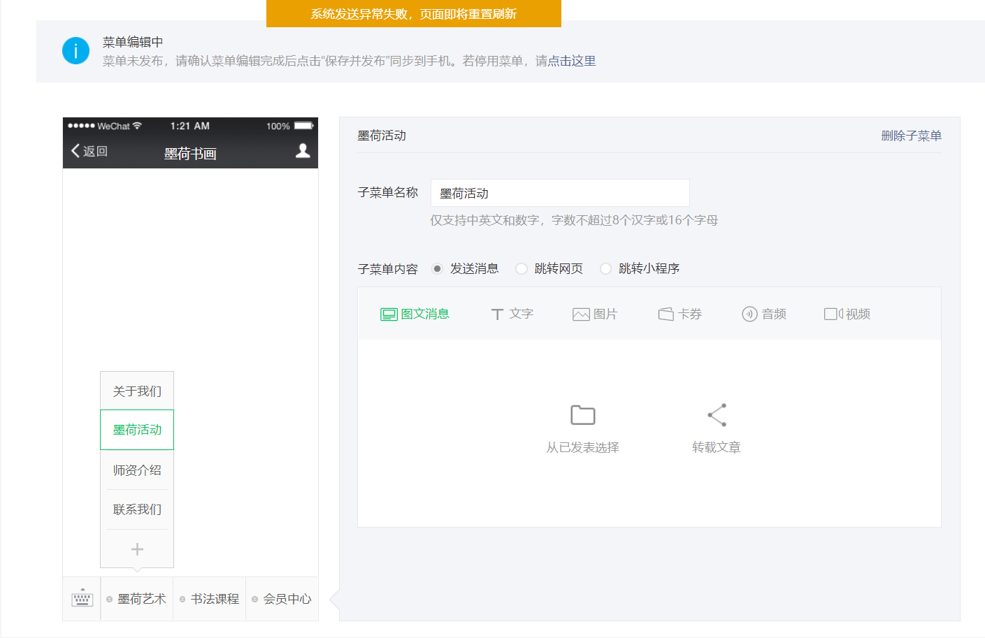 公众号自定义菜单点击某个菜单出现“系统发送异常失败,页面即将重新刷新”?而且菜单怎么取消编辑保持和线上发布的一样啊?