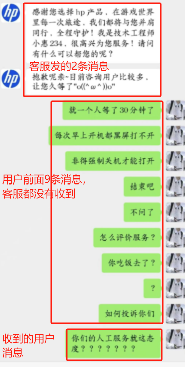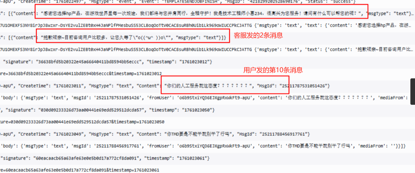 2025-10-21T13:03:32.472+08:00 "Content": "你们的人工服务就这态度???????", "MsgId": "25211787531051426"(这个MsgId前面的9条消息没有收到)