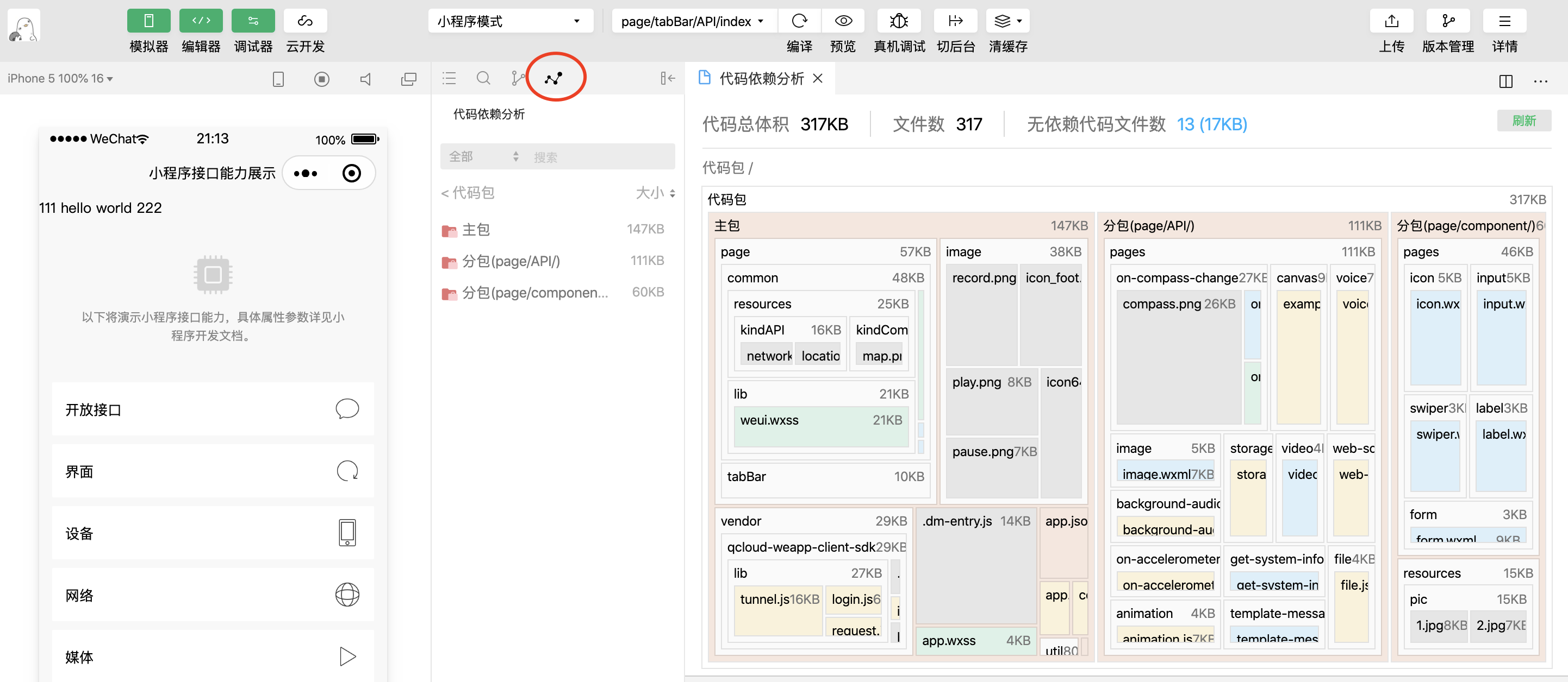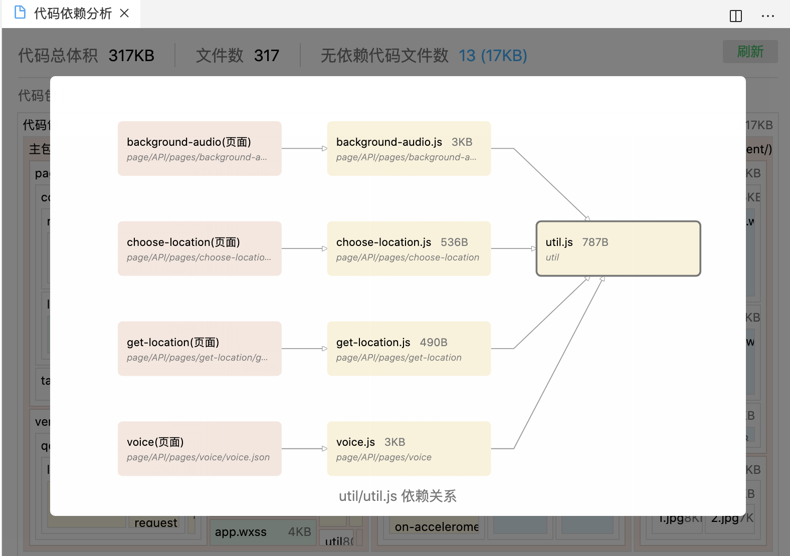 代码静态依赖分析插件,在本地通过对代码文件进行分析,找出了代码包中包含的文件列表,以及各个代码文件间的依赖关系。并提供可交互的界面,方便开发者查看代码包的文件构成和依赖关系,优化代码包大小和内容。