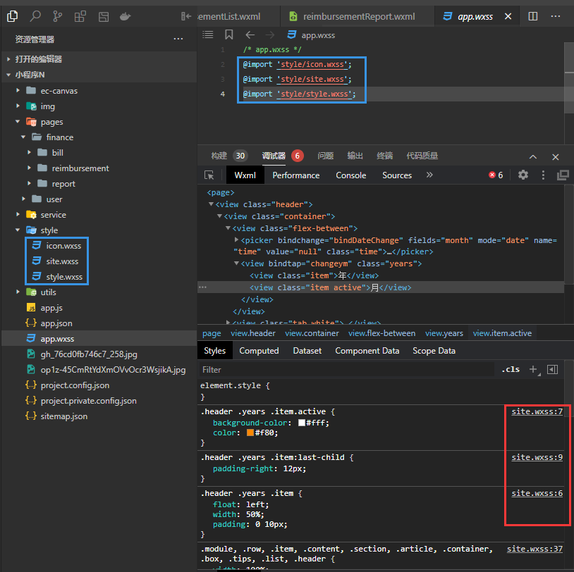 图片里的样式是写在style.wxss文件中的,但被定位到了site.wxss文件中了。