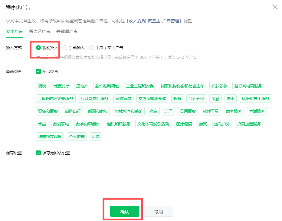 在撰写图文内容的时候,插入广告模块,明明选择了“智能插入”,确认保存之后,状态显示的依旧是“不开启文中广告”,见如下截图
