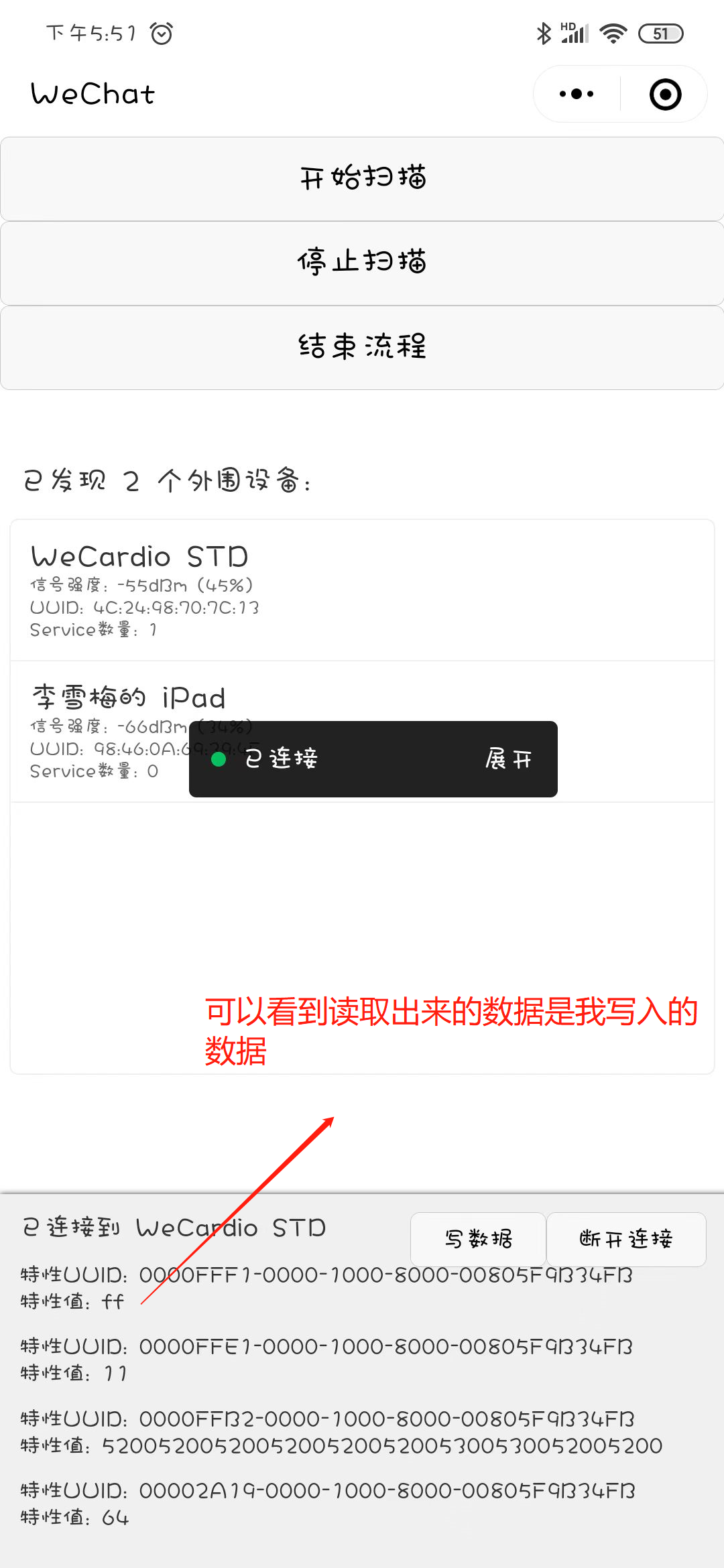 但数据似乎写入进去了。通过 readBLECharacteristicValue 读取到的 特征value 为我写入进去的值。虽然我不是要我写入的值,而是要通过写入 让设备反馈给我数据。