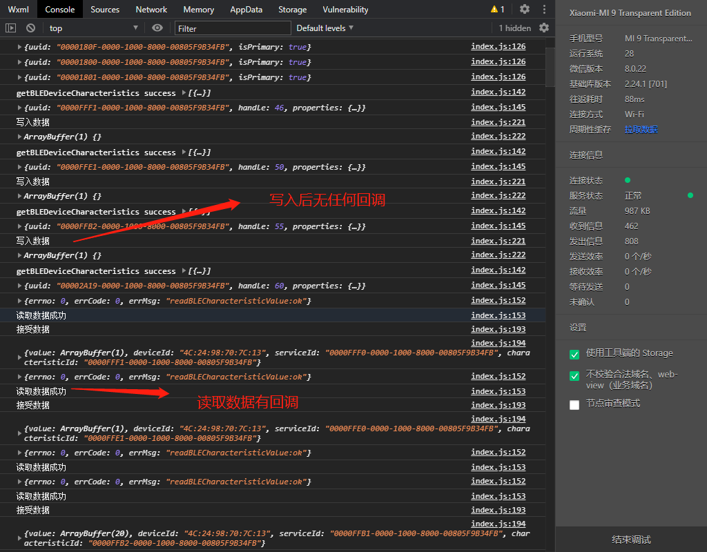 writeBLECharacteristicValue 写入接口调用后无任何回调。success,fail,complete 都没有回调。onBLECharacteristicValueChange 也没有触发