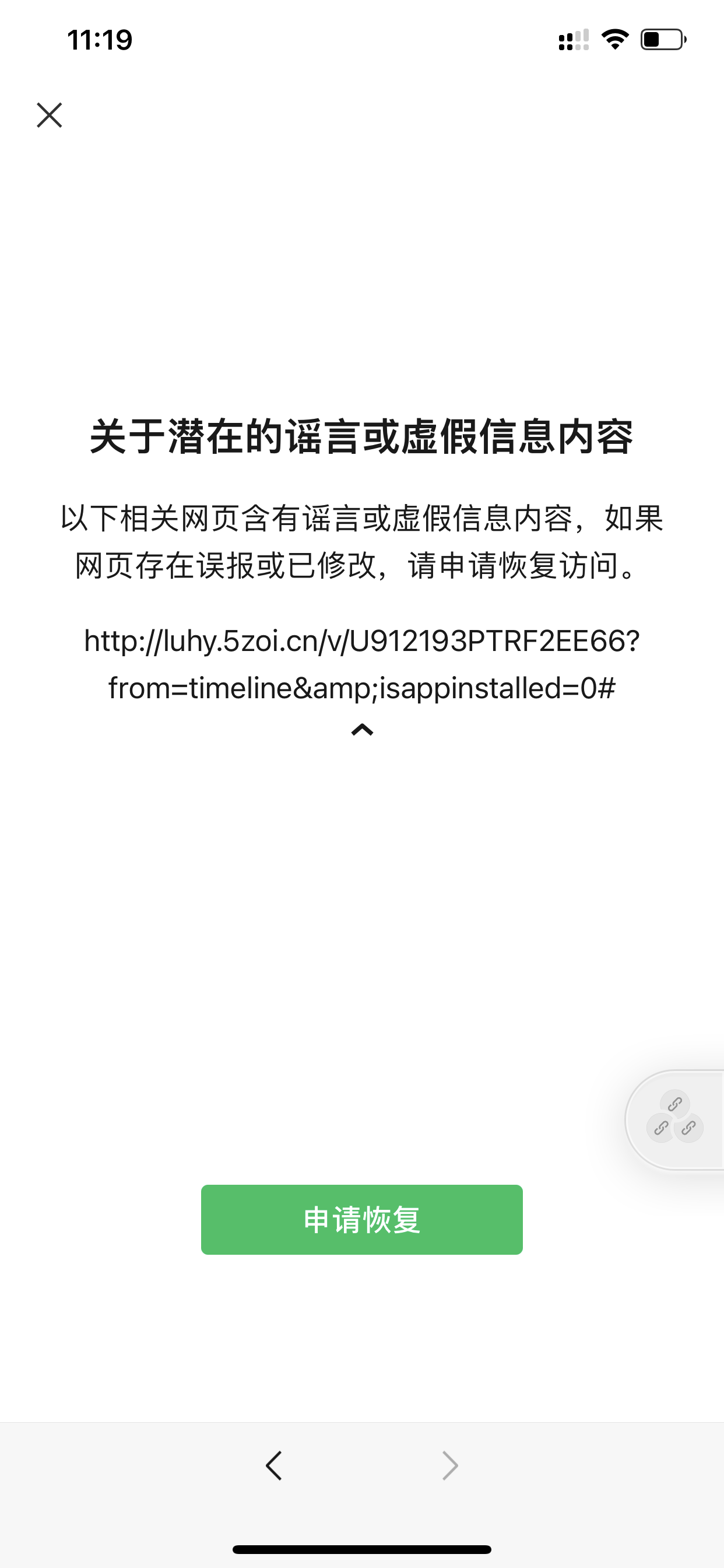 你好,经核实,域名www.5zoi.cn下的链接http://luhy.5zoi.cn/v/U912193PTRF2EE66?from=timeline&isappinstalled=0#的违规内容已经修改,现已恢复微信内直接访问的服务,请知悉。