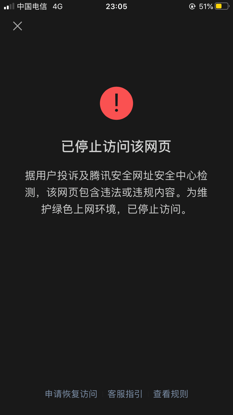 你好,出现这个提示的话是被手机管家拦截,此服务不在受理范围,请登录手机管家官网【http://gj.qq.com/online_server/complain_url.html】自行申诉,知悉。