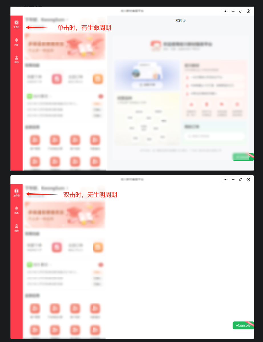 单击可以正常切换switchTab标签,并且可以正常执行页面生命周期。但是双击时无生明周期,且右侧区域显示空白。