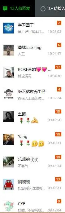 A客服显示的其他客服和客人沟通的信息界面,实际其他客服并没有转接客人给A客服,但是界面上一下子就显示了这么多信息,点进去后就会看到是其他客服处理过的客人,聊天界面最下面就是对话结束的提示