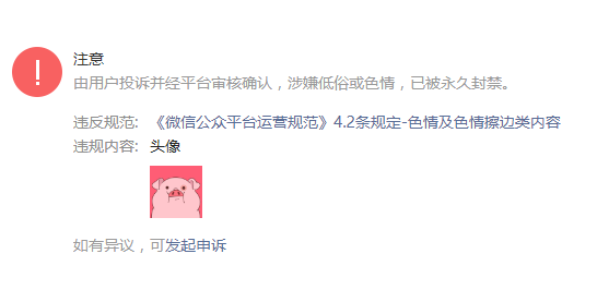 你好,经核实,头像是没有违规,但该公众号导流到色情网站,故被永久封禁。