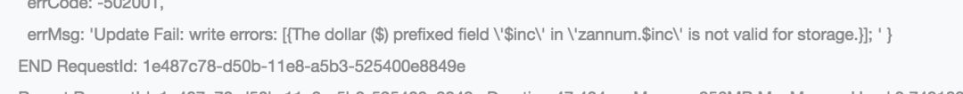 { Error: errCode: -502001 database request fail | errMsg: Update Fail: write errors: [{The dollar ($) prefixed field '$inc' in 'zannum.$inc' is not valid for storage.}];