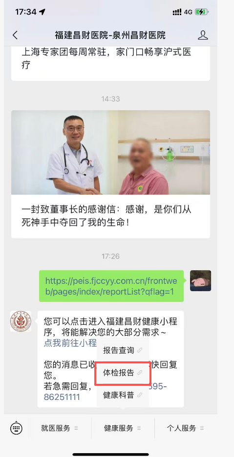 公众号的自定义菜单,添加跳转地址:https://peis.fjccyy.com.cn/frontweb/pages/index/reportList?qflag=1