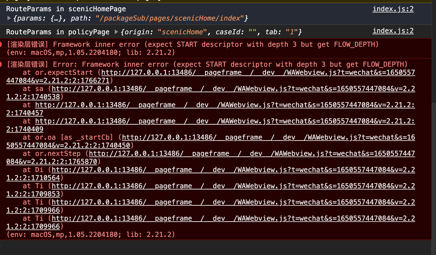 [渲染层错误] Framework inner error (expect START descriptor with depth 3 but get FLOW_DEPTH)(env: macOS,mp,1.05.2204180; lib: 2.21.2)