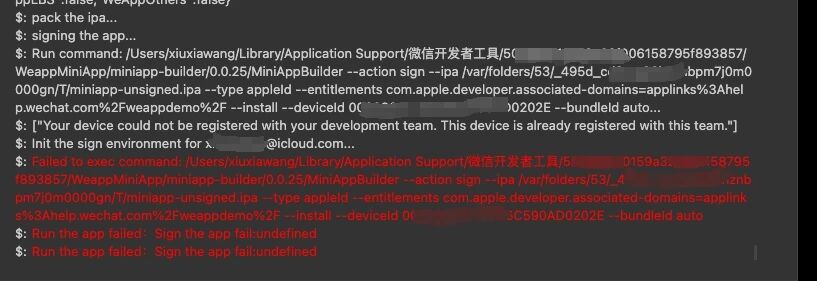 真机调试报错, 红色错误上有一行显示“Your device could not be registered with your development team. This device is already registered with this team."