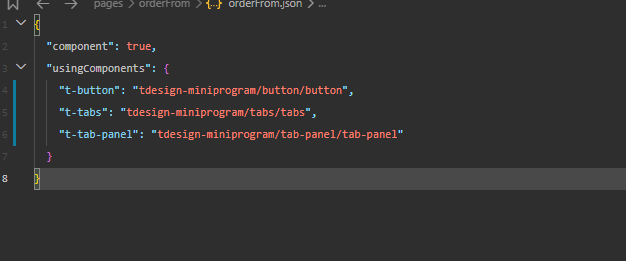 报错信息:[ pages/orderFrom/orderFrom.json 文件内容错误] pages/orderFrom/orderFrom.json: ["usingComponents"]["t-tab-panel"]: "tdesign-miniprogram/tab-panel/tab-panel" 未找到(env: Windows,mp,1.06.2209190; lib: 2.29.1)