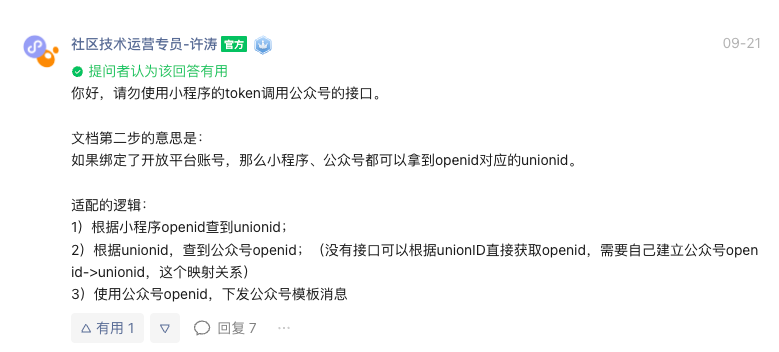 是这样的 我们的小程序和公众号是绑定的 年初的时候用历史模板 当初用的方法是可以用小程序的appid和secret去换取token 然后用小程序的openid去发送公众号消息;但是现在这个方法被禁用了,我看了官方文档,现在是用的公众号的appid和secret去发,然后问题就来了,之前的小程序的openiD用不了,必须是用户对应公众号的openId才能发送成功;但是用户小程序微信授权登录我又只能读取到他对应小程序的openId,要如何才能获取到他公众号的openId去发送消息呢