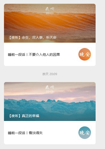 如何像公众号夜听这样,每天发的第一个作品的题目是在它的图片上的啊,我发的作品全是在我的首图的下方,还带着摘要,是不是定时同时发布两个作品就像夜听这样显示了啊?