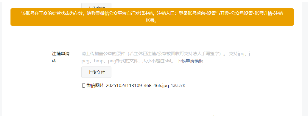 没办法注销账号。提交资料提示:该账号在工商的经营状态为存续,请登录微信公众平台自行发起注销。注销入口:登录账号后台-设置与开发-公众号设置-账号详情-注销账号。