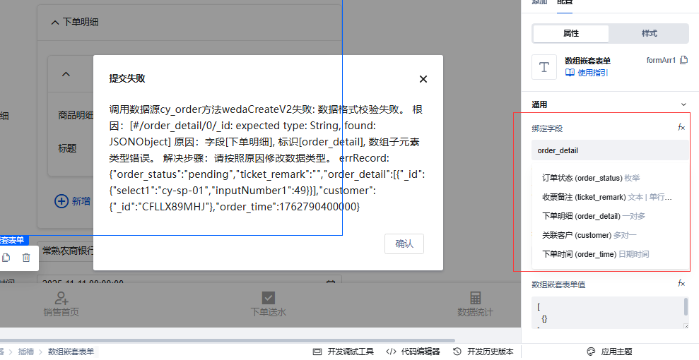 如何在表单容器中添加数组嵌套表单后,提交关联子表单的数据,例如下单数据中添加下单商品明细:商品A:数量30;单价50;总金额XX;商品B.......商品C.....,对象嵌套绑定字段要绑定数组嵌套表单还是无需绑定?直接用数组嵌套绑定关联表order_detail ? 希望老师指导下该如何操作