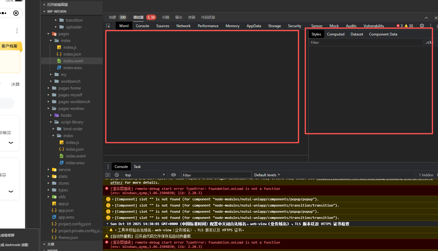 页面是能正常显示的 但是Wxml部分没有页面相关内容无法进行选中页面元素进行调试 版本wechat_devtools_1.06.2504030_win32_x64 清缓存 重开 都不行 当前开发的是危险小程序