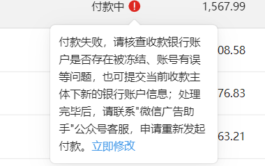 你好,后台绑定的结算银行卡,因账户存在异常导致支付失败了,请及时联系开户行处理,或者更换为正常可以收款的银行卡,待解决之后再联系我们申请重新发起付款。