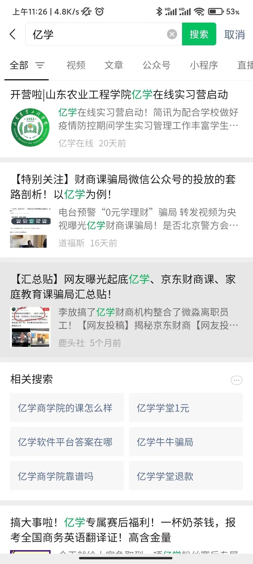 2、搜索我司信息:亿学学堂,联想词出现恶意引导性词语:亿学学堂是骗子吗,这属于恶意诽谤,并没有任何权威媒体报道我司的负面信息,我司对外形象一直良好,我司亿学是一家正规的财商教育机构,该联想词将我司与骗子联系在一起且点击进去后毫无任何相关信息,于用户,无参考价值,于我司,对品牌以及我司代表人造成了严重的创伤,综上,以上具有恶意引导性的词汇严重影响了我司的正常经营。