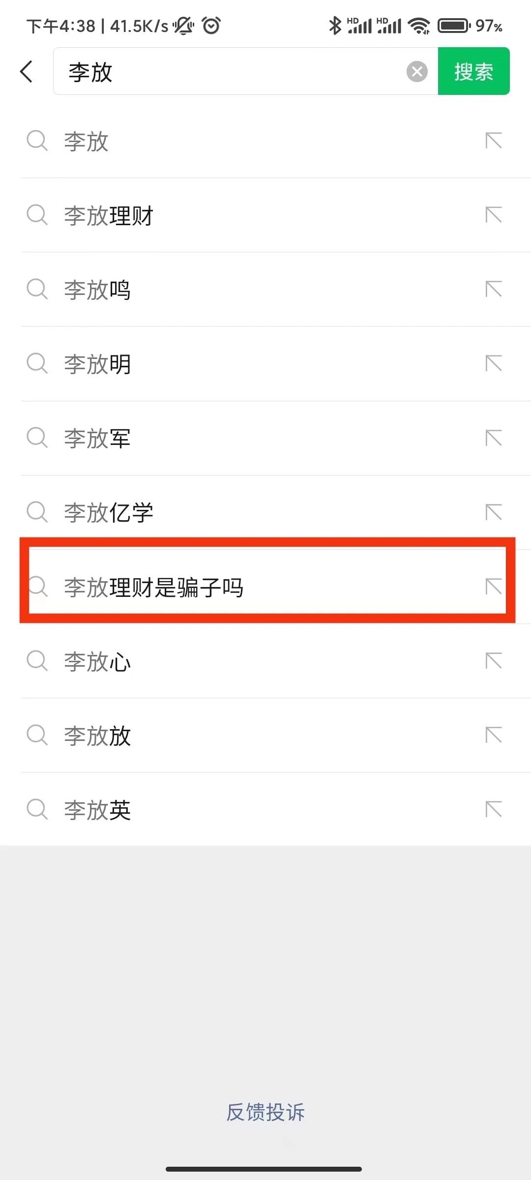 1、搜索我司信息:李放,联想词出现恶意引导性词语:李放理财是骗子吗,这属于恶意诽谤,并没有任何权威媒体报道我司李放的负面信息,我司代表人的对外形象一直良好,该联想词将我司与骗子联系在一起且点击进去后毫无任何相关信息,于用户,无参考价值,于我司,该联想词虽未疑问语句,但却具有攻击性,对品牌以及我司代表人造成了严重的创伤。