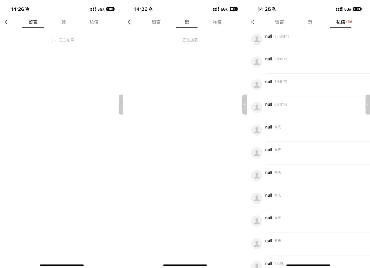 页面显示的留言、赞的数据一直是「正在加载」,私信的内容则显示为灰色头像和null。