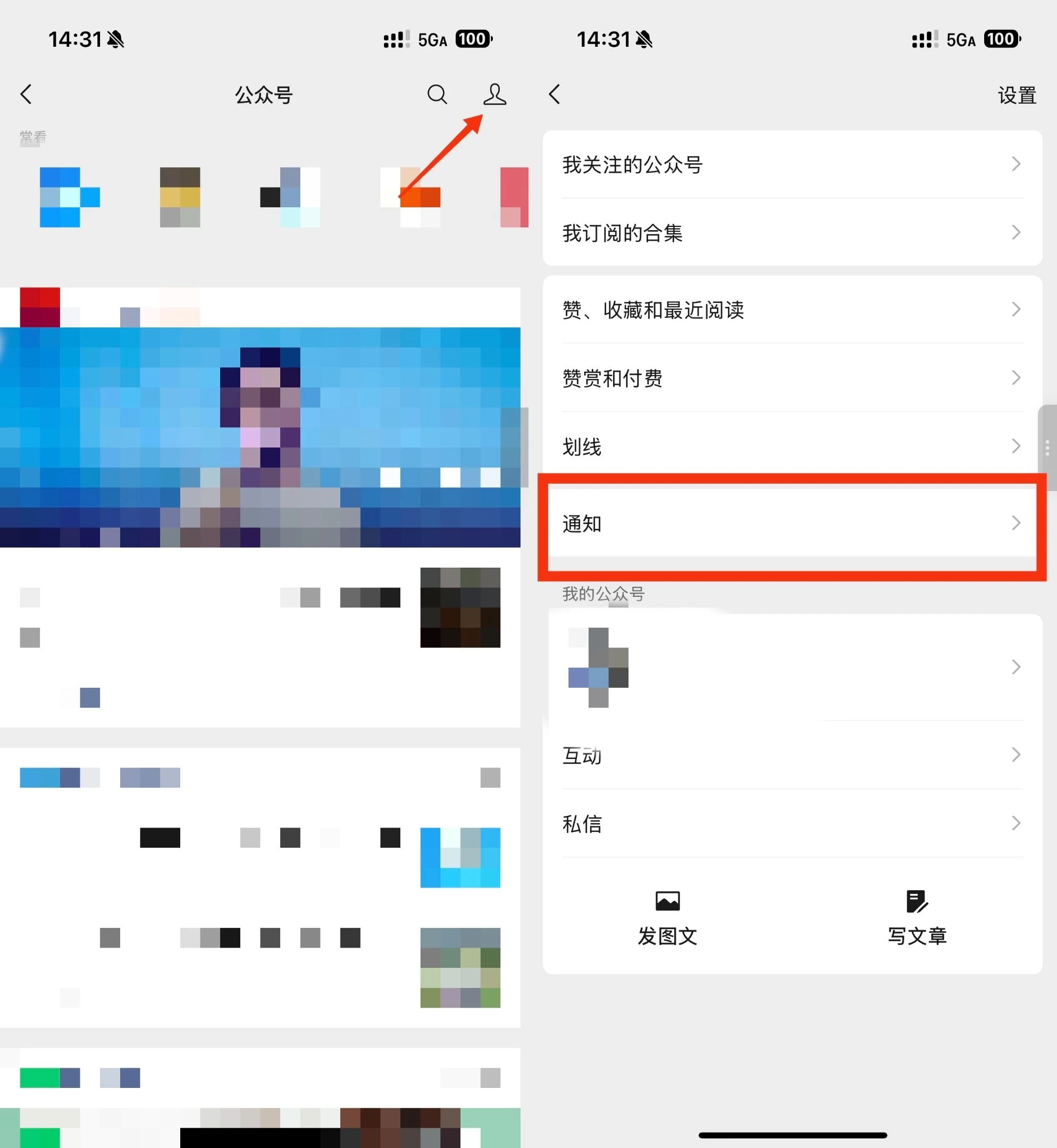 【问题描述】从公众号列表右上角人像图标进入,点击通知,