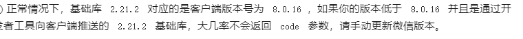 ③ 正常情况下,基础库 2.21.2 对应的是客户端版本号为 8.0.16,如果你的版本低于 8.0.16 并且是通过开发者工具向客户端推送的 2.21.2 基础库,大几率不会返回 code 参数,请手动更新微信版本。