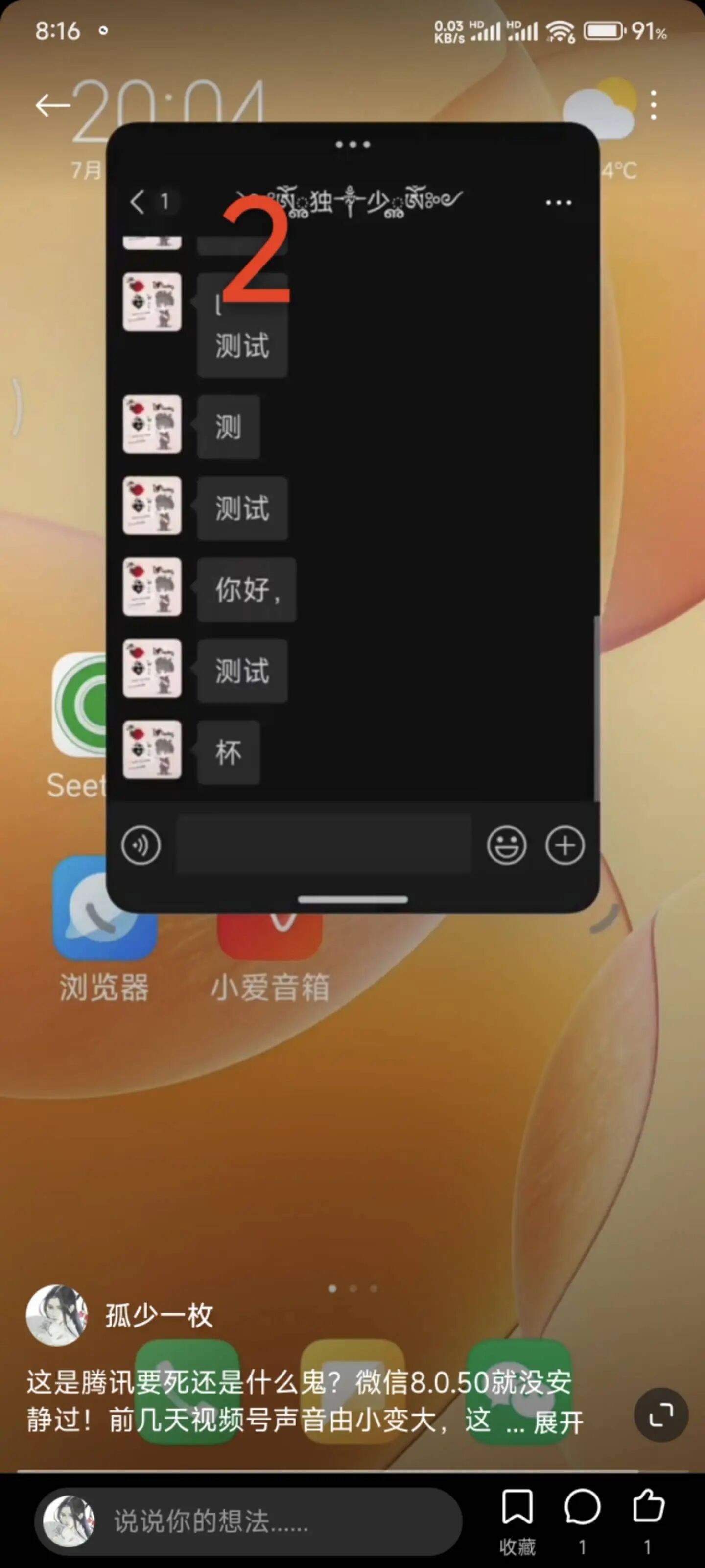 升级到微信8.0.50后当正在浏览微信视频号,公众号,看一看,听一听,朋友圈等页面时来微信消息点小窗回复消息直接变成小窗模式,图片1为8.0.50之前的图片2为8.0.50以及之后的!正常的该是图片1这样的。这是怎么回事??