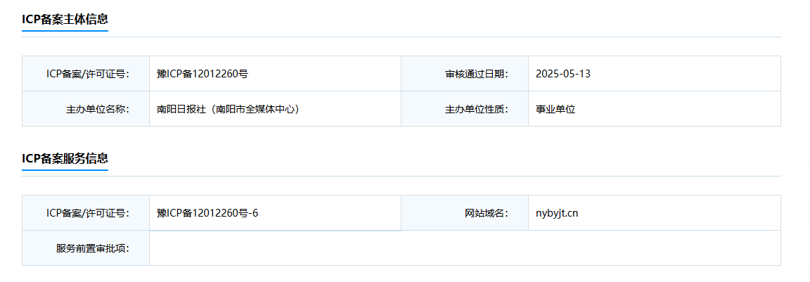 域名:nybyjt.cn , 域名已经通过工信部、公安机关和党政机关事业单位备案。ICP备案: 豫ICP备12012260号-6 公安机关备案: 豫公网安备41130302000680号 党政机关事业单位备案电子标识编号:CA172630000601874790002