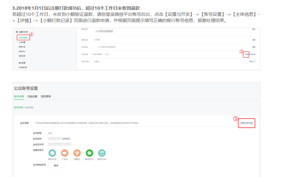 公司改名后,找回公司微信公众号时,采用对公打款验证,打款两次均显示验证失败,核实到汇款账户和指定账户不一致,本次打款无效。已经一个月了,打款的金额都没有退回,应该怎么联系客服或者退回呢?