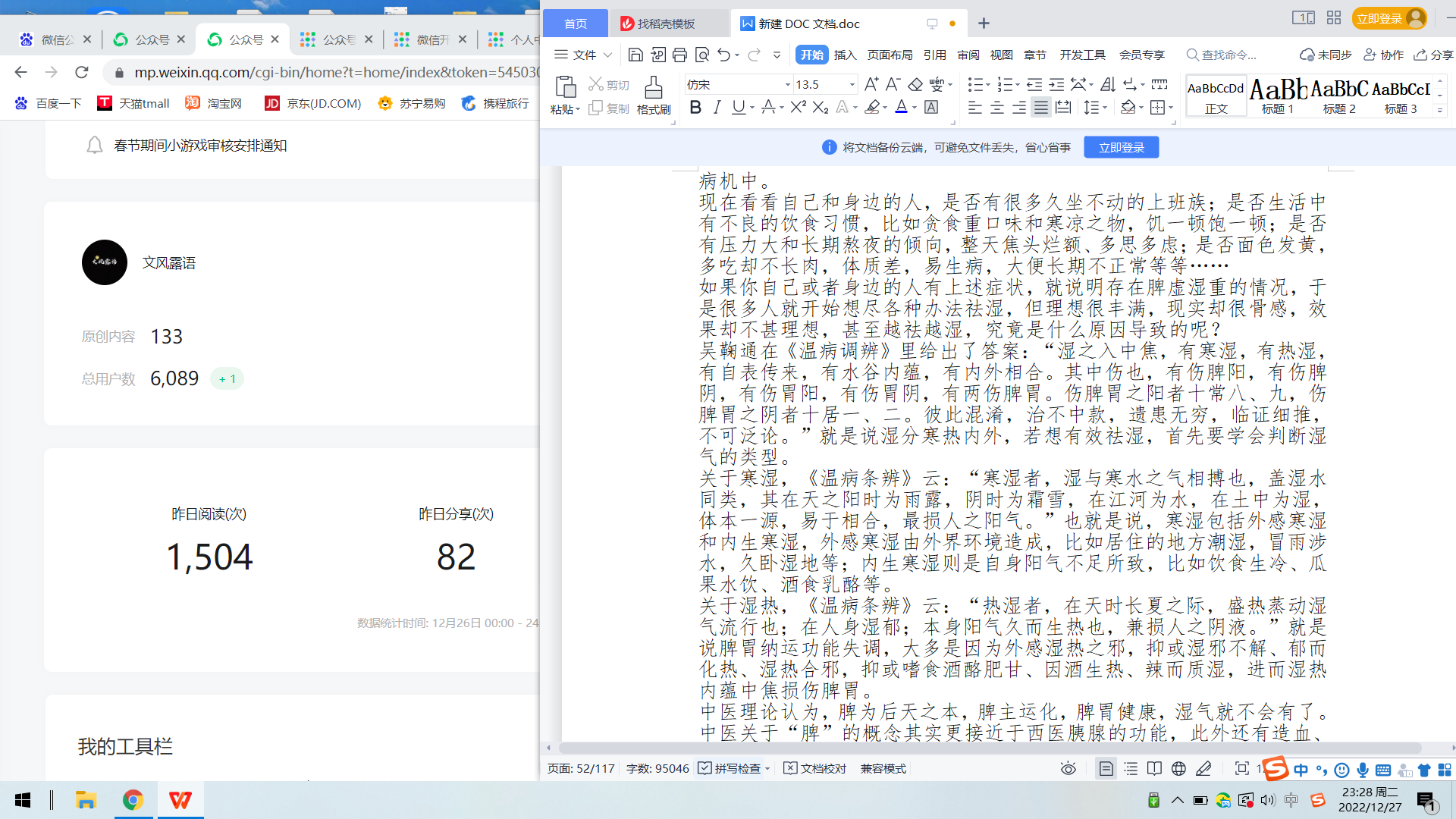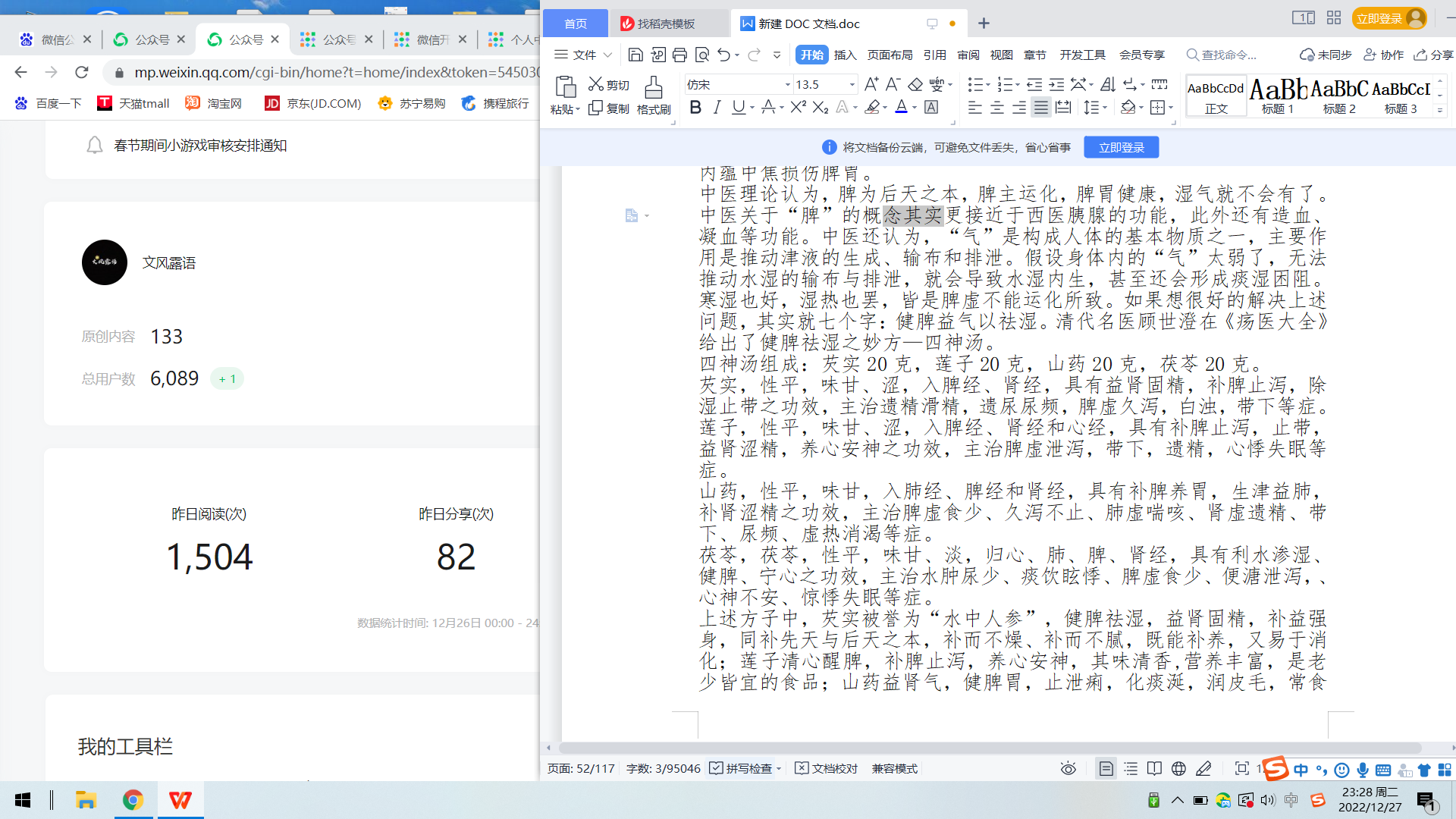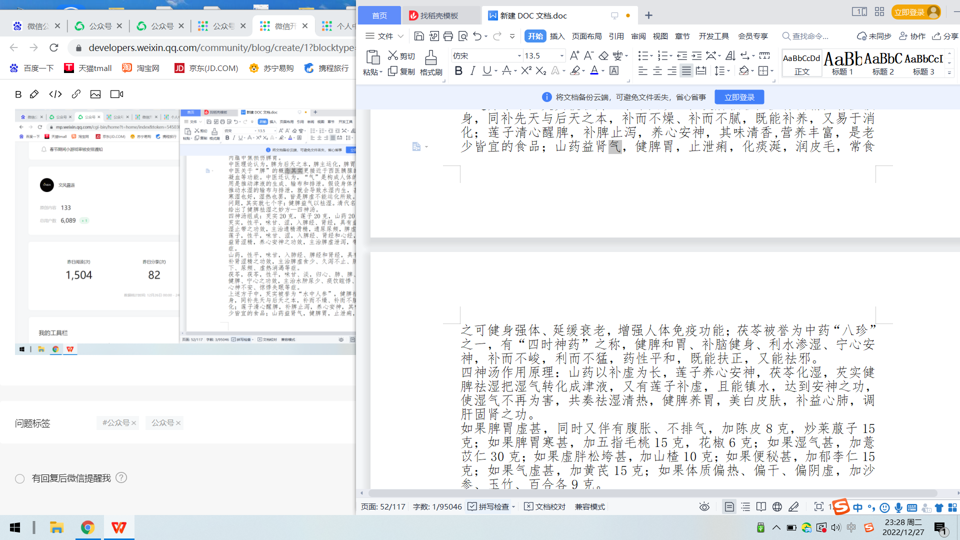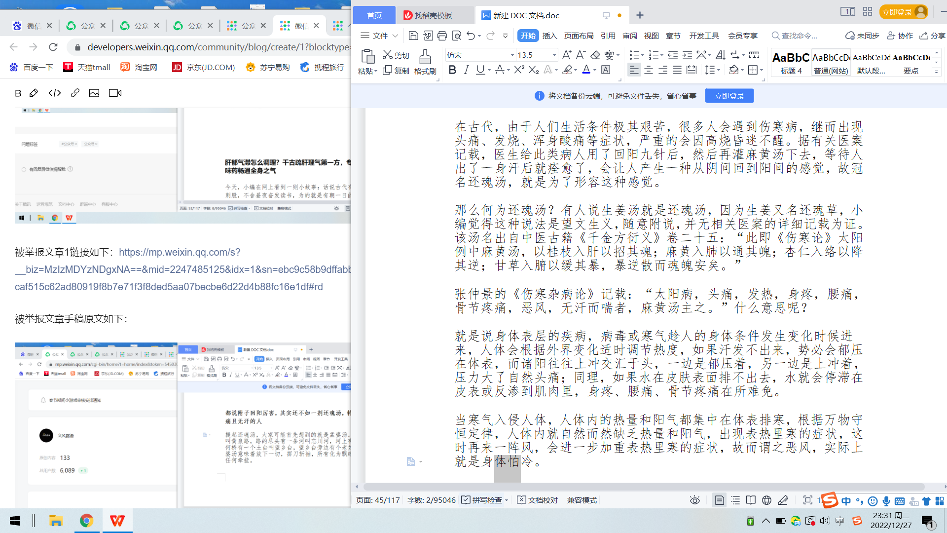 本人微信公众号名称:文风露语。原始ID:gh_d7542e5af1cf。12月份,本人公众号刚做的有起色,就被接二连三的举报,尽管成功申诉成功3篇文章,但是公众号的阅读量和粉丝量均大幅下降,每当原创功能刚刚恢复,不停的更文,刚有起色,就又被恶意举报,然后再次被限制功能。我实在是搞不明白,我到底抄袭谁的文章了,网络查重率达到多少为洗文?中医的草药功用和方剂都是自古都有的,比如大家带都知道 人参是补益的,难道我非要说人参是攻下的才叫原创?好好的一个公众号居然被举报的没法继续写下去,到底写那些文章有没有用,平台可以查询读者后台的留言,为什么别人一举报,就要限制公众号的各种功能?望平台能再次给予指点,谢谢!