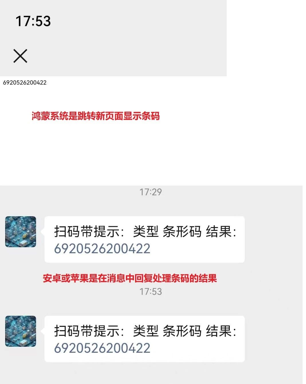 鸿蒙4以下版本,扫码可以在公众号内回复条码内容