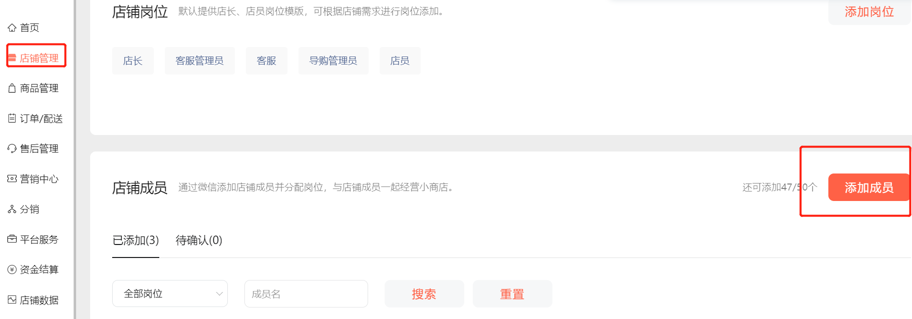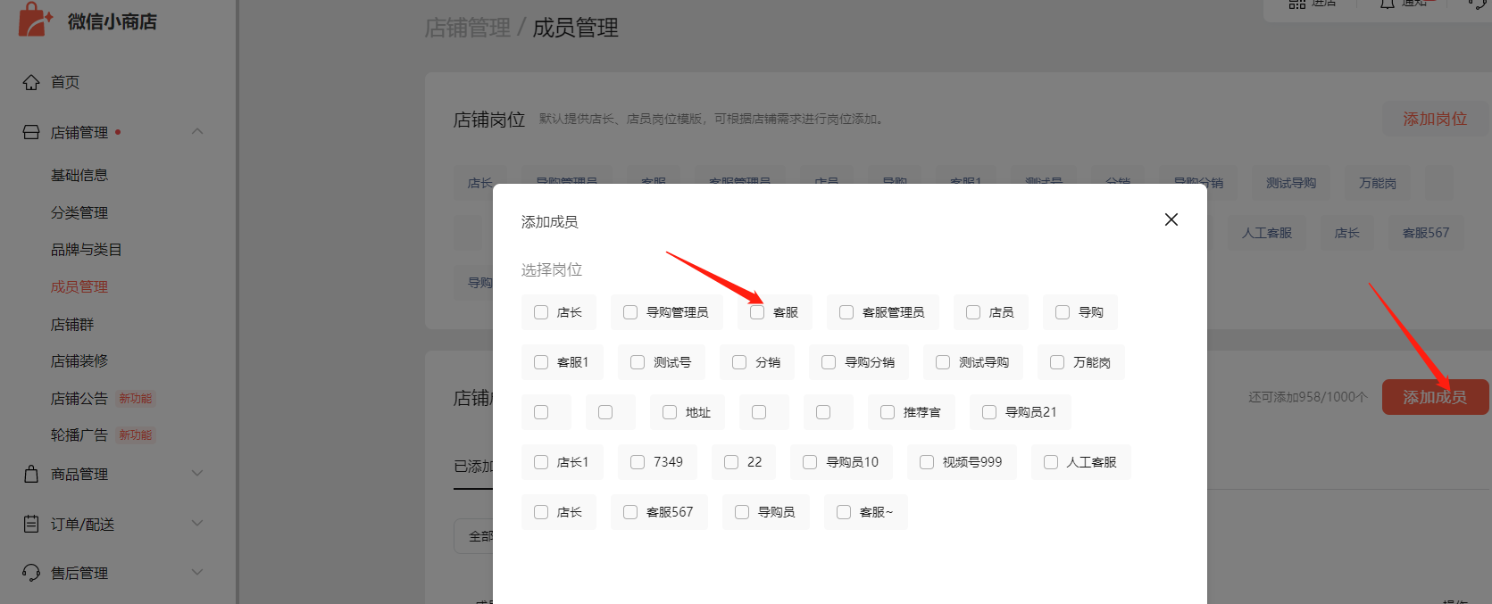 登陆电脑端网页后台https://shop.weixin.qq.com/ 店铺管理-成员管理-添加成员 勾选客服岗位