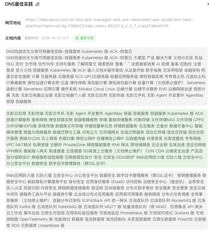 我把阿里云ACK的文档和腾讯kubernetes的网页导入到文档知识之后,无法确定是否解析恰当。而且回答明显命中率很低。
