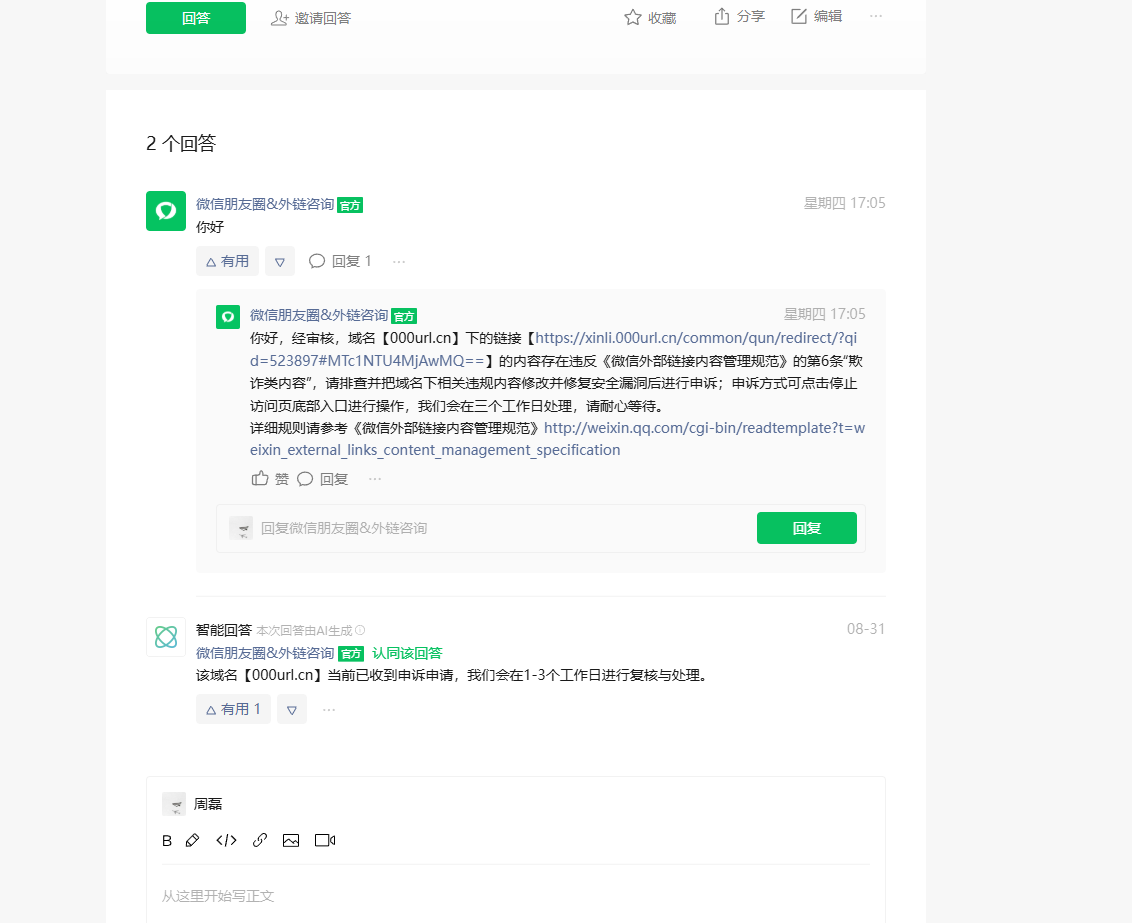 000url.cn是我司业务所使用域名,网站提示网页包含恶意欺诈内容,为维护绿色上网环境,已停止访问?网站主要是便于商家私域获客,我司积极自查,网站没有违规行为,所有域名经过腾讯安全管家检测均为安全域名。具体截图如下,上周提交申诉反馈为域名【000url.cn】下的链接的内容存在违反《微信外部链接内容管理规范》的第6条“欺诈类内容”,我司已经停止该内容,希望可以人工重新审核