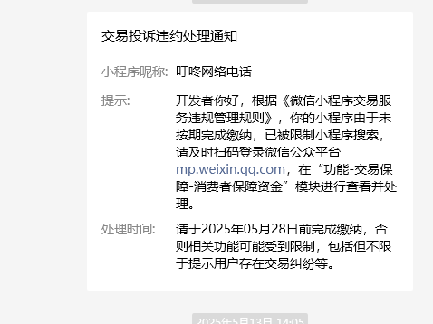 违约金缴纳入口路径:https://mp.weixin.qq.com/ 支付与交易-交易保障-消费者保障资金 点击缴纳充值,若无法进入mp后台进行缴纳的话,可暂无需理会该通知。
