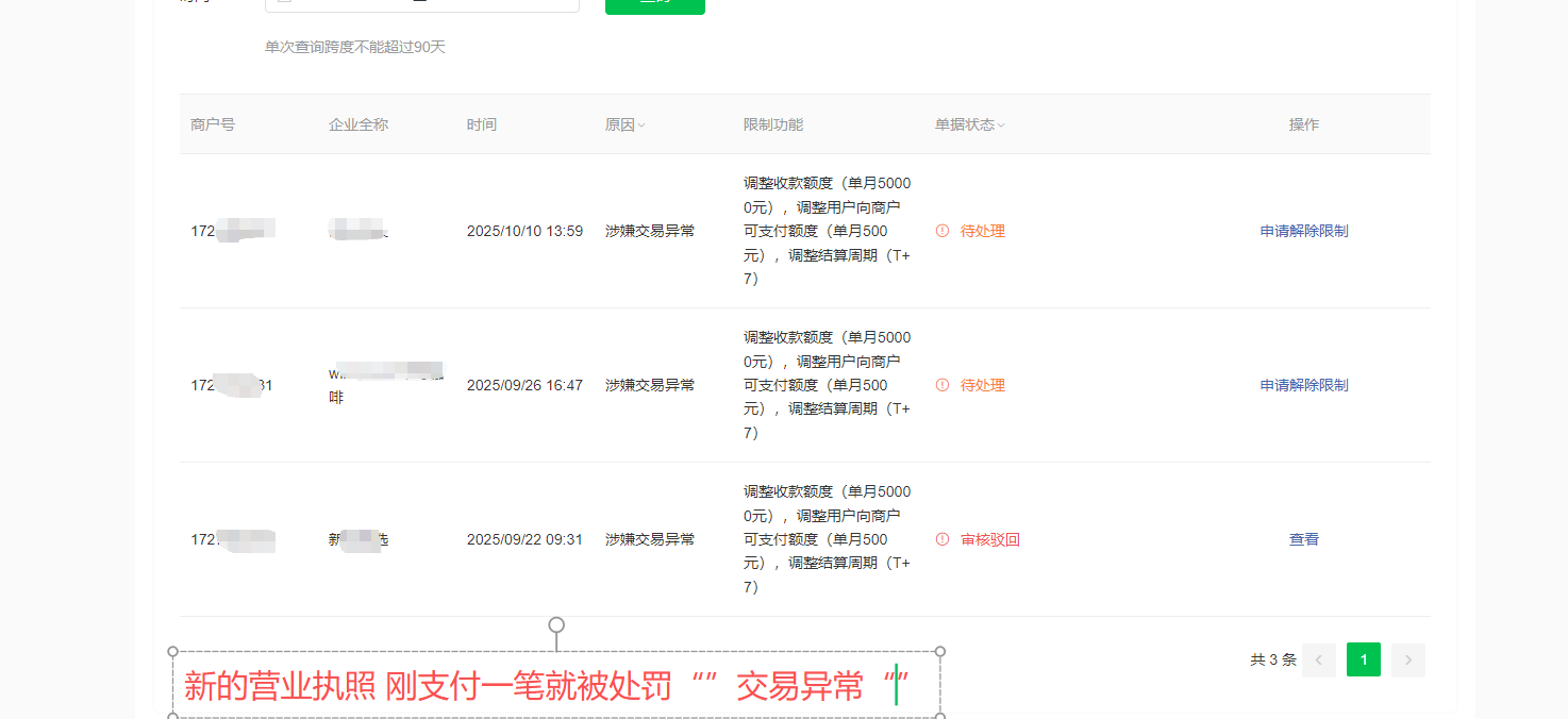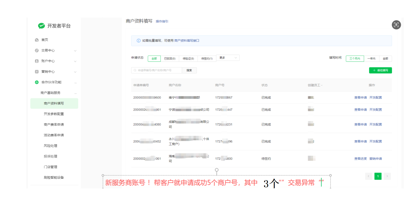 我们是服务商 我们商户号是“1727596132 ” 最近几天我们新是商户号 才帮客户申请5个商户号 其中3个就被标记异常!!!到底什么原因??