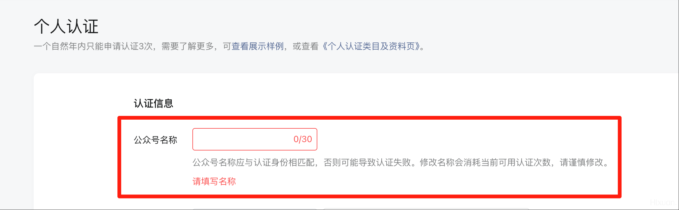 进入个人认证提交页面后就会有「公众号名称」的修改入口。