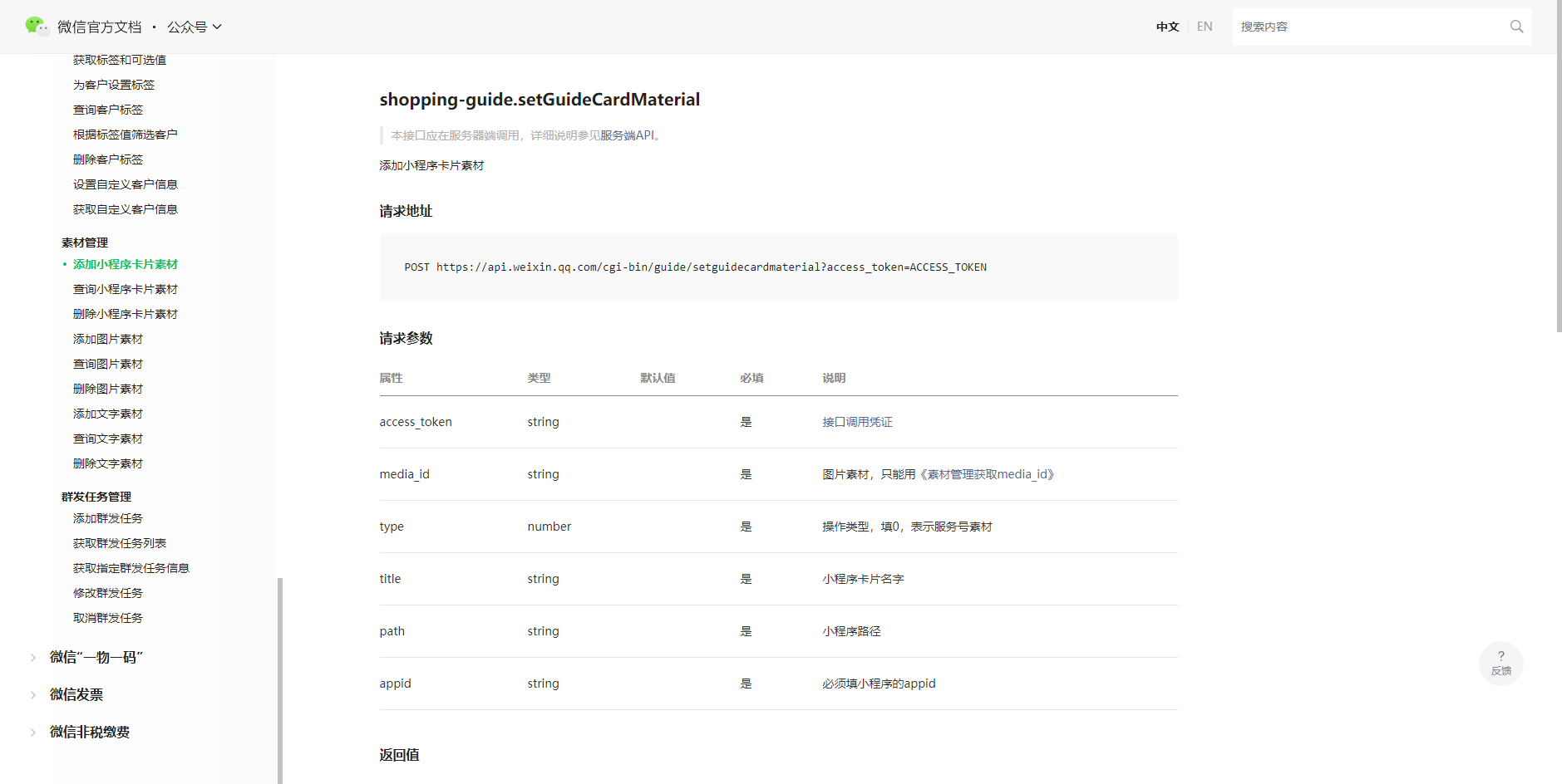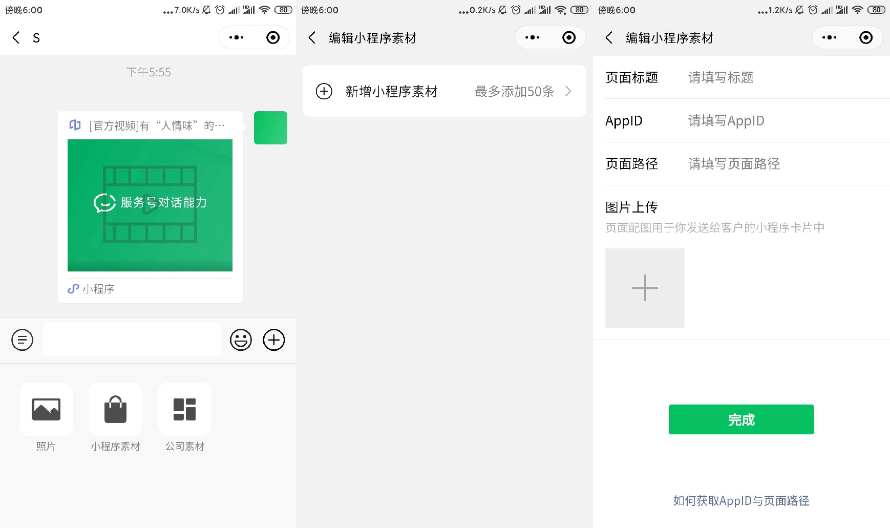 服务号运营者通过MP端、API接口添加公司的小程序卡片素材,顾问通过小程序端添加个人的小程序卡片素材都放开主体限制,可以添加与公众号没有关联的小程序素材,详情可查阅《产品文档》《接口文档》。