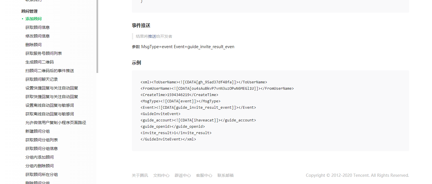为了方便服务号运营者对顾问确认环节的管理,顾问确认添加成功,会给开发者推送事件,详情可查阅《接口文档》