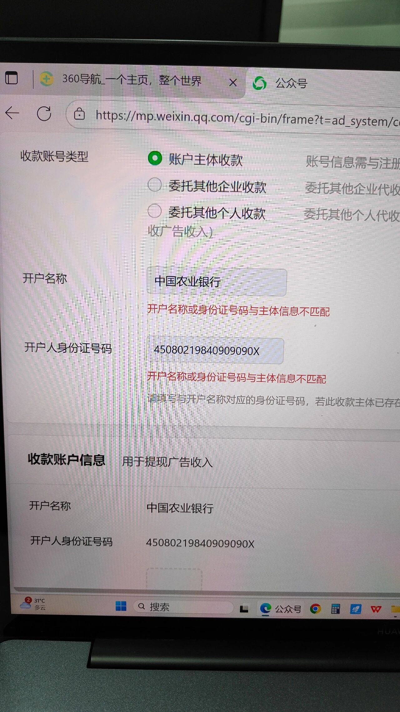 您好,我的公众号 原始 ID 是:gh_9218c3b619b8,名称是:米朵妈。 问题:设置流量主结算账户时,反复提示:“客户名称和客户人身份信息不匹配”。 我已完成所有可能的自查,请务必帮我查询后台验证日志: 1. 银行信息核实: 我已电话联系发卡行([您的银行名称])确认,银行系统预留的姓名、身份证号与我所填完全一致,且身份信息有效未过期。 2. 信息格式无误: 我已确保:姓名无空格/全角字符;身份证号为半角数字且末尾‘X’为大写;银行卡号准确无误;公众号主体与结算人信息匹配。 3. 操作尝试: 我已更换浏览器、清除缓存、重新输入多次,问题依旧。 因此这应该不是用户端输入错误的问题,即可能是系统验证接口或数据同步问题,恳请客服同志帮我解决一下,谢谢