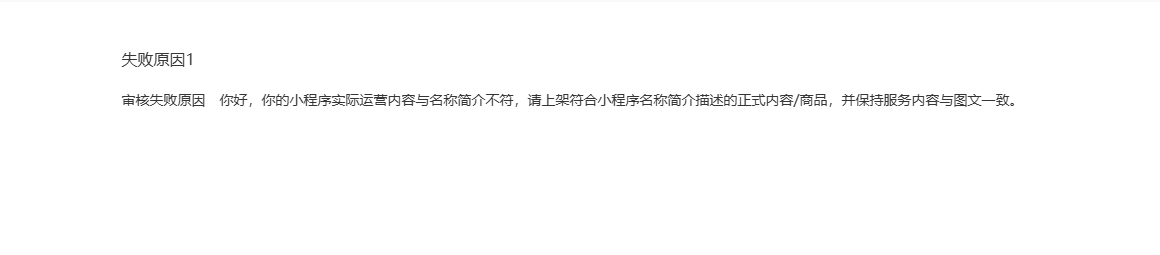 你好,经核实,小程序最新版本实际运营内容与名称简介不符,建议上架符合小程序名称简介描述的正式内容/商品,并保持服务内容与图文一致。