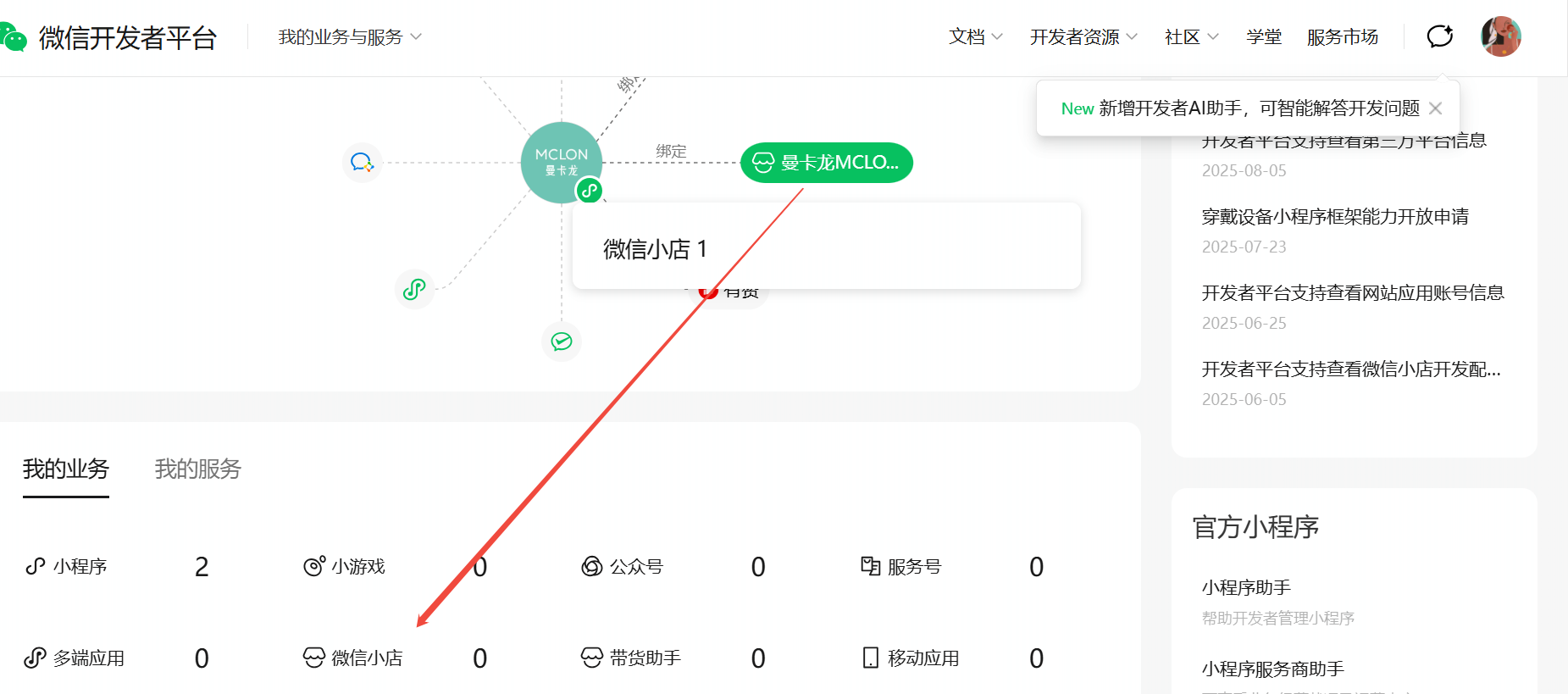 但是无法绑定,但是我看关系图谱又有个微信小店