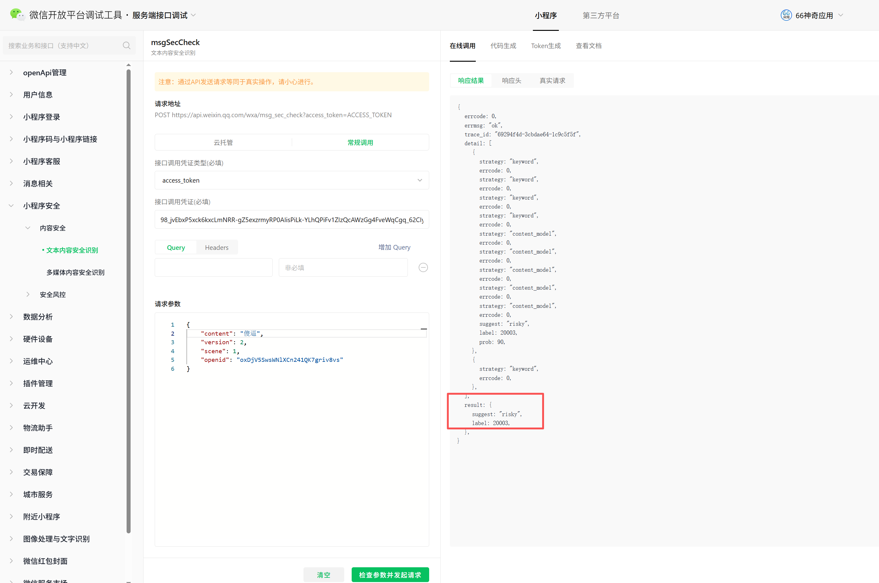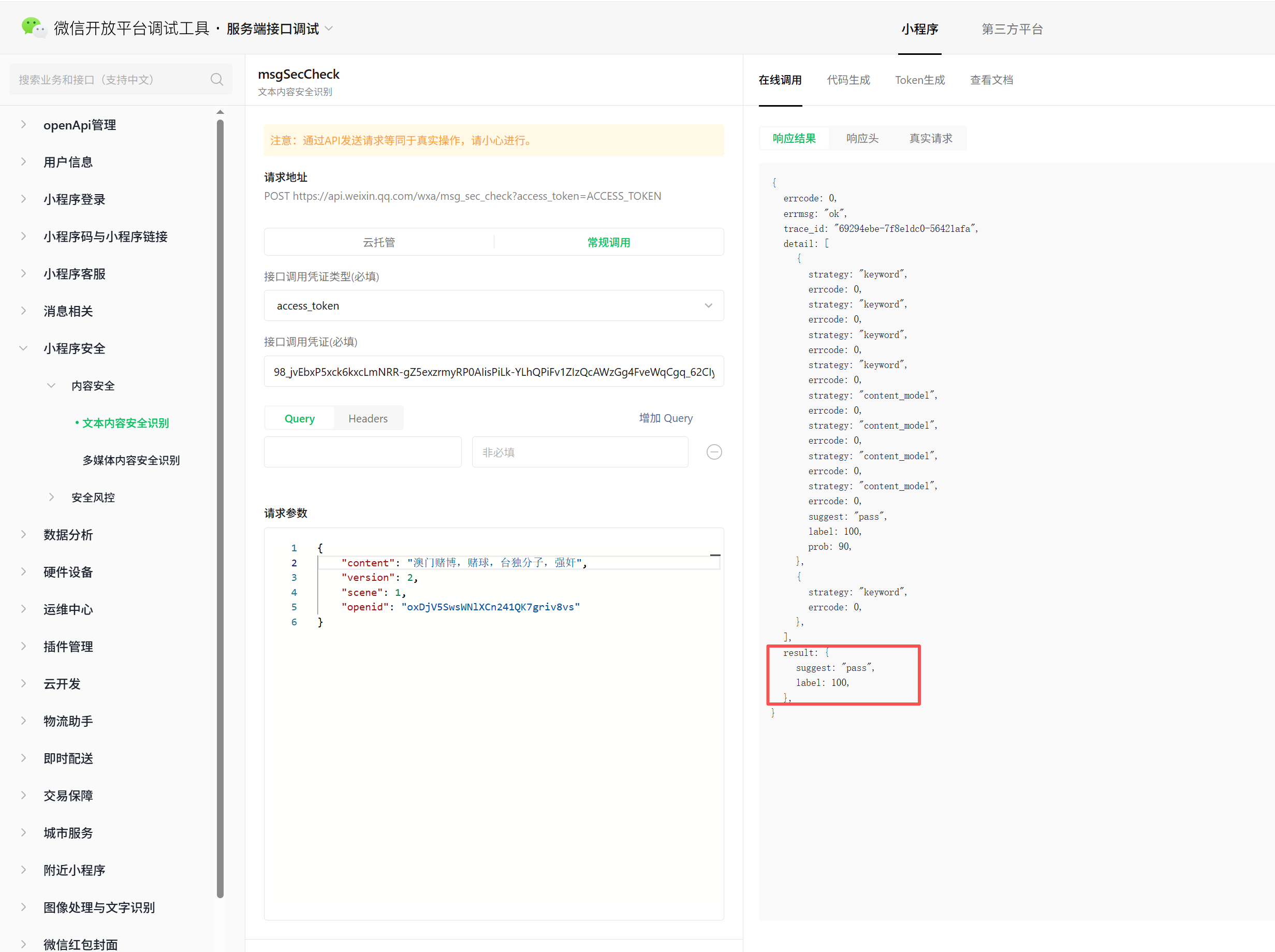 用c#在服务端调用msgSecCheck处理文字,自己在小程序后台添加的违禁词可以识别出来,但是不是后台添加的任何违禁词,返回都是pass。